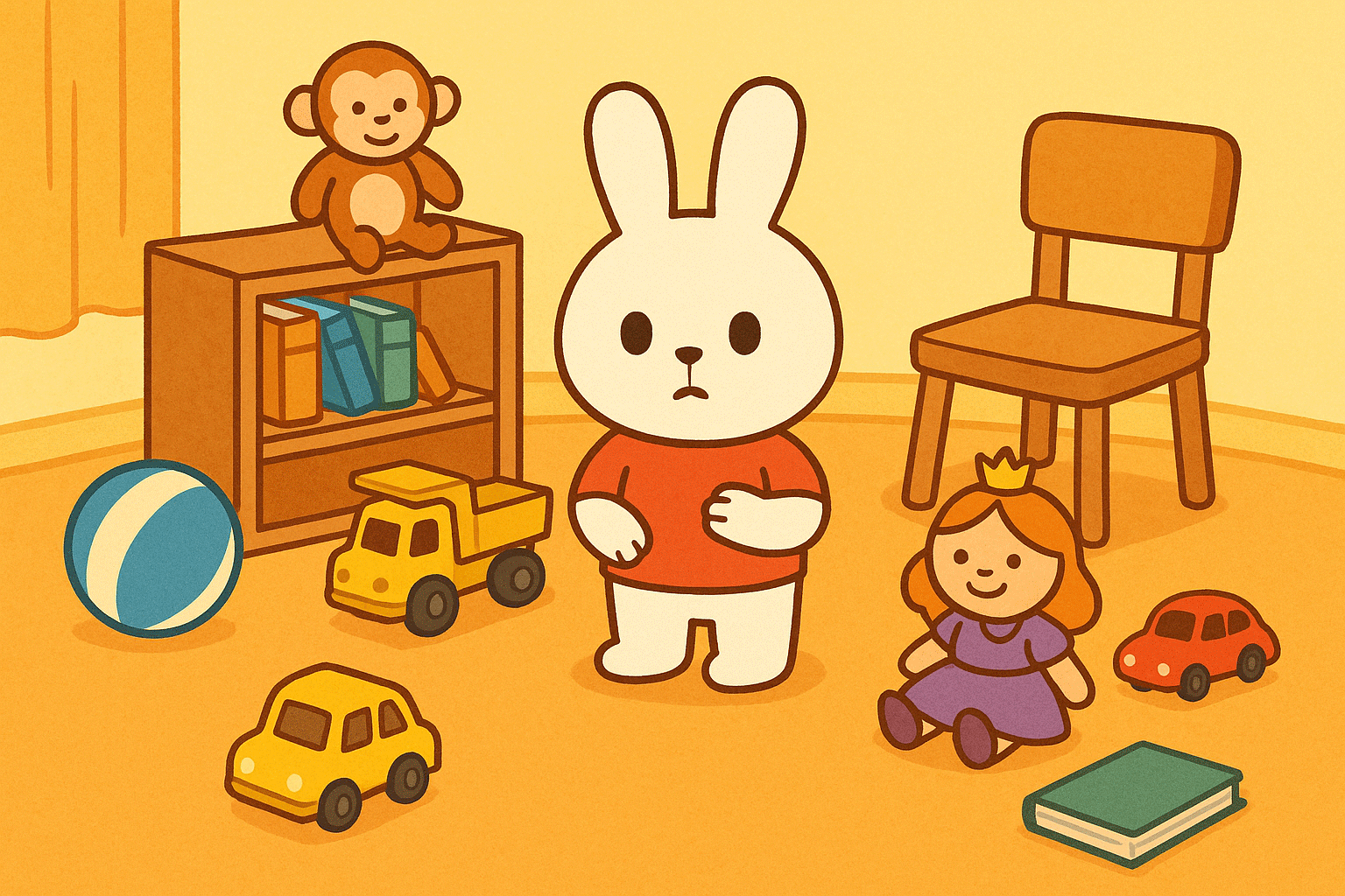 চারদিকে ছড়ানো অনেক জিনিসপত্র—বল, পুতুল, বই, চেয়ার|