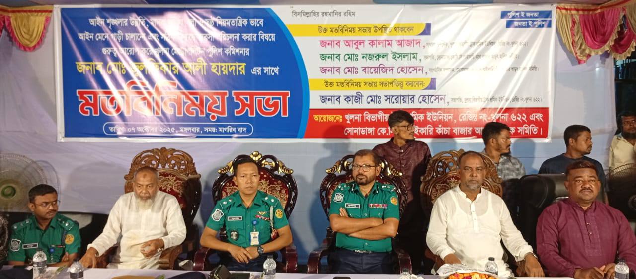 আইন-শৃঙ্খলার উন্নয়ন, মাদকবিরোধী সচেতনতা, নিয়ম মেনে যানবাহন পরিচালনা এবং সুশৃঙ্খলভাবে ব্যবসা পরিচালনার লক্ষ্যে খুলনা মেট্রোপলিটন পুলিশের সঙ্গে এক মতবিনিময় সভা অনুষ্ঠিত হয়েছে। গত ৭ অক্টোবর ২০২৫ তারিখ সন্ধ্যায় খুলনা বিভাগীয় ট্রাক শ্রমিক ইউনিয়ন ও কাঁচা বাজার আড়ৎ মালিক সমিতির আয়োজনে এ সভা অনুষ্ঠিত হয়।