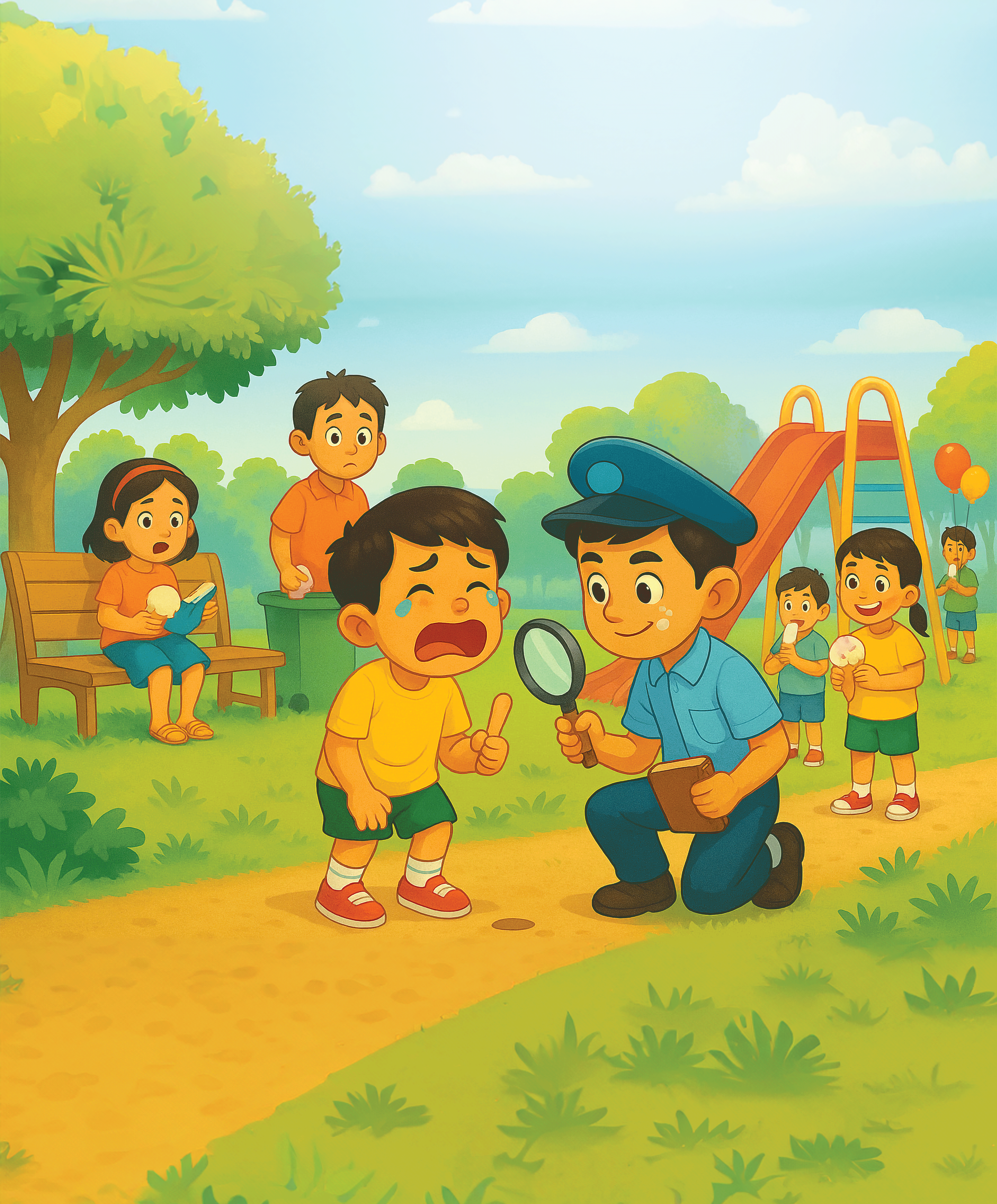 রিয়াদ কাঁদছে—তার হাতে শুধু আইসক্রিমের কাঠি, কিন্তু আইসক্রিমটা কোথায় গেল? হইচই পড়ে গেল।