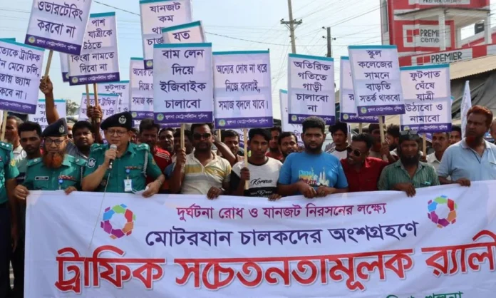 দুর্ঘটনা রোধ ও যানজট নিরসনের লক্ষ্যে খুলনা মেট্রোপলিটন পুলিশের উদ্যোগে গল্লামারী এলাকায় ইজিবাইক চালকদের অংশগ্রহণে ট্রাফিক সচেতনতামূলক একটি বর্ণাঢ্য র্যালি অনুষ্ঠিত হয়েছে।