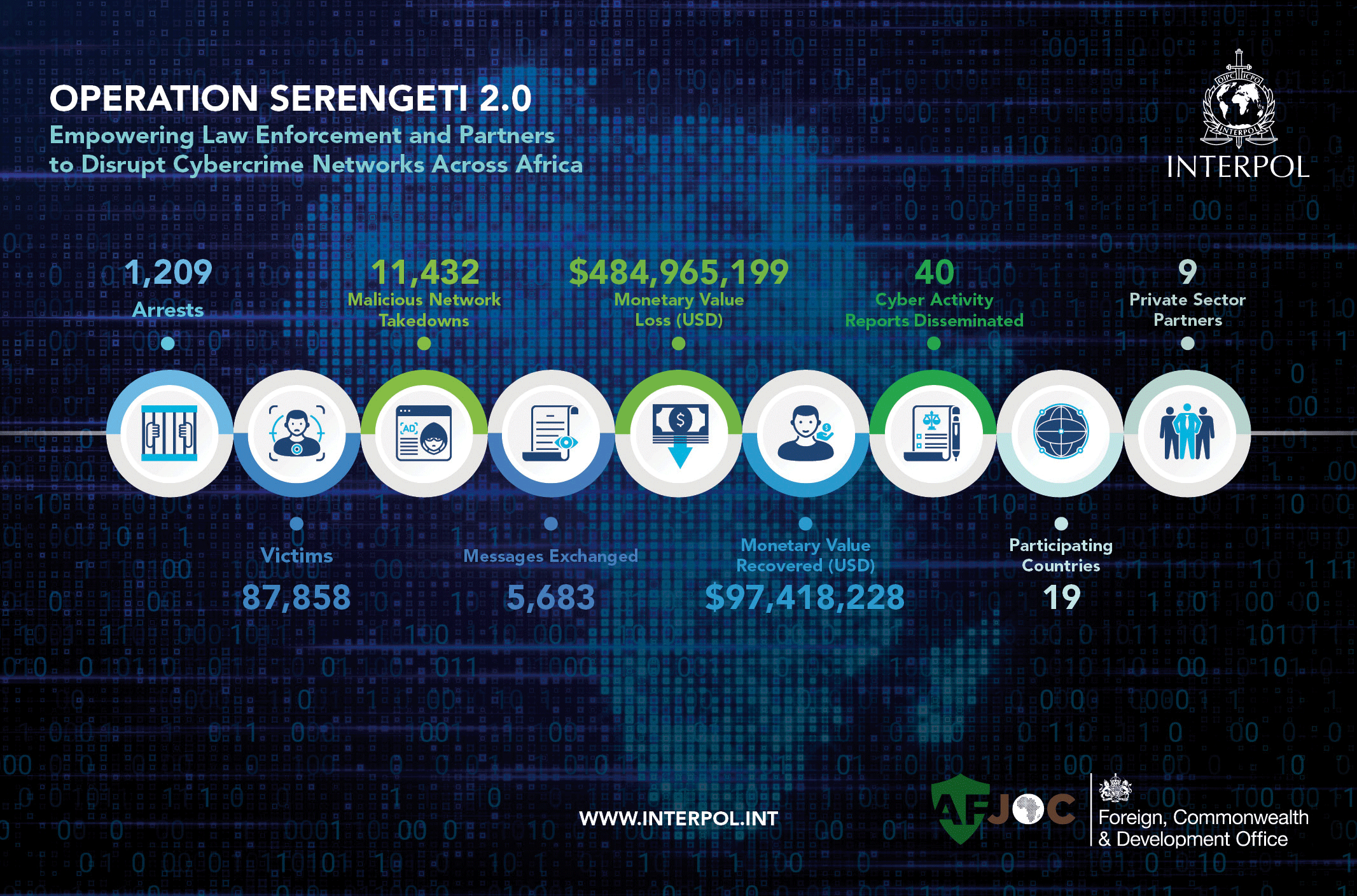 সফল এই অভিযানে ১,২০০ জন সাইবার অপরাধীকে গ্রেফতার করা সম্ভব হয়েছে এবং সেই সাথে ৯৭.৪ মিলিয়ন ডলার (প্রায় ১০৭৫ কোটি টাকা) মূল্যের অবৈধ সম্পদ জব্দ করা হয়েছে। অপরাধ দমনের এই প্রক্রিয়ায় আফ্রিকায় ২৫টি অবৈধ ক্রিপ্টোকারেন্সি মাইনিং সেন্টার ধ্বংস করা হয়।