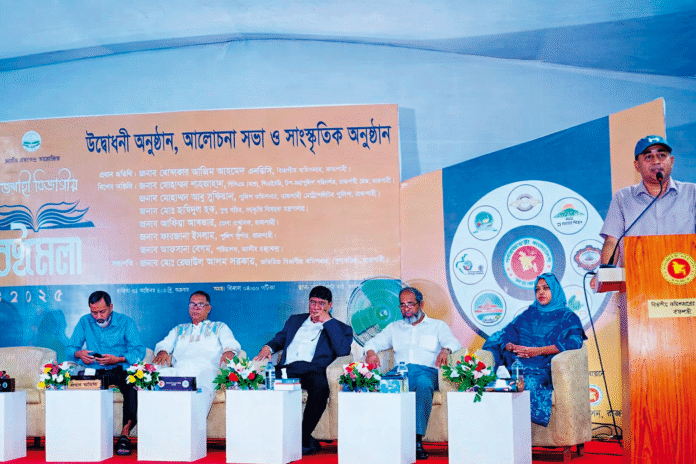 গত ৩১ অক্টোবর ২০২৫ রাজশাহীর কালেক্টরেট মাঠে জাতীয় গ্রন্থকেন্দ্রের আয়োজনে “বিভাগীয় বইমেলা-২০২৫”-এর উদ্বোধনী অনুষ্ঠান, আলোচনা সভা ও সাংস্কৃতিক আয়োজন অনুষ্ঠিত হয়। বেলুন ও ফেস্টুন উড়িয়ে মেলার আনুষ্ঠানিক উদ্বোধন করা হয়।অনুষ্ঠানে প্রধান অতিথি হিসেবে উপস্থিত ছিলেন খোন্দকার আজিজ আহমেদ, এনডিসি, বিভাগীয় কমিশনার, রাজশাহী। বিশেষ অতিথি হিসেবে বক্তব্য রাখেন মোহাম্মদ আবু সুফিয়ান, কমিশনার, রাজশাহী মেট্রোপলিটন পুলিশ।আলোচনা সভায় পুলিশ কমিশনার বলেন, বর্তমান সমাজে অতিরিক্ত মোবাইল স্ক্রিন ব্যবহারের কারণে তরুণদের মধ্যে পাঠাভ্যাস কমে যাচ্ছে। এ প্রেক্ষাপটে বই পড়ার অভ্যাস গড়ে তোলা এবং তরুণ সমাজকে বইয়ের সঙ্গে যুক্ত করতে বইমেলার মতো উদ্যোগ অত্যন্ত প্রয়োজনীয়। তিনি বলেন, জ্ঞান অর্জনের জন্য বইয়ের বিকল্প নেই; তবে প্রকৃত শিক্ষা সেই জ্ঞানই, যা সমাজকে ইতিবাচকভাবে পরিচালনায় সহায়ক হয়।তিনি আশা প্রকাশ করেন, এই বইমেলার মাধ্যমে রাজশাহীসহ সারাদেশে পাঠাভ্যাসের নতুন উদ্দীপনা সৃষ্টি হবে। অনুষ্ঠানের শেষাংশে তিনি লেখক, পাঠক, প্রকাশক, শিক্ষার্থীসহ উপস্থিত সকলকে এবং আয়োজকদের আন্তরিক ধন্যবাদ জানান।
