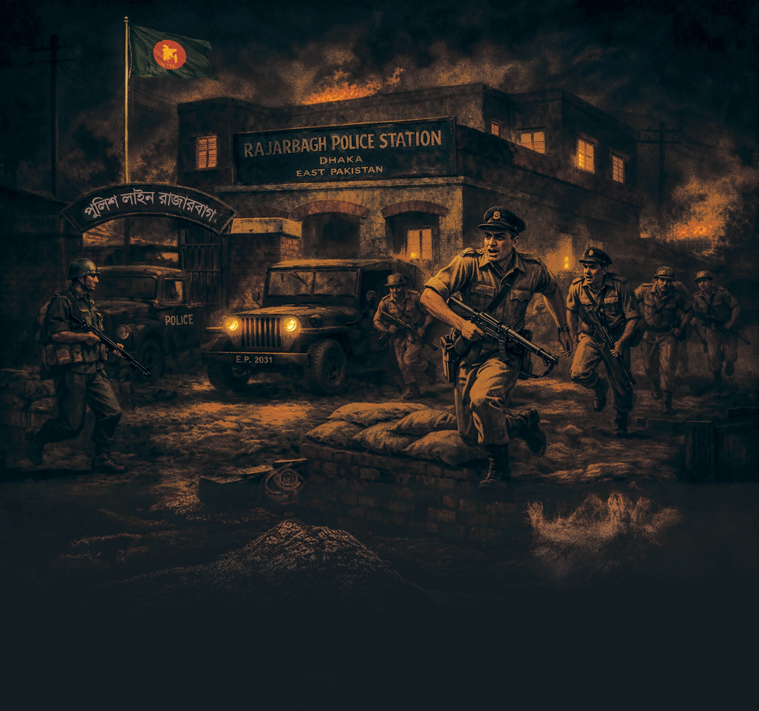 ১৯৭১ সালের ২৫ মার্চ, বিকাল থেকেই পূর্ব পাকিস্তানের রাজধানী ঢাকায় বিরাজ করছিল এক অস্বাভাবিক নীরবতা। সবার মাঝেই চলছিল চাপা উত্তেজনা, রক্তের উৎকণ্ঠা আর এক অনিশ্চিত বাস্তবতা। এতদিনের মিছিল, মিটিং, প্রতিবাদমুখর ঢাকা যেন হঠাৎ থমকে গেছে। আতঙ্কের কালো ছায়া শহরের ওপর ভর করে বসেছে।শহরজুড়ে ছড়িয়ে পড়ছিল নানান খবর—ক্যান্টনমেন্টগুলোতে পাকিস্তানি সেনাবাহিনীর তৎপরতা ও যুদ্ধের প্রস্তুতির আভাস পাওয়া যাচ্ছিল। সারি সারি সাঁজোয়া যান, সৈন্যবহর—সব মিলিয়ে যেন পুরোদমে যুদ্ধের আয়োজন। একদিকে নিরীহ মানুষ, অন্যদিকে নিজেদের করের টাকায় লালিত সেই সেনাবাহিনী যেন জনতার ওপর তাদের নিষ্ঠুর লেলিহান শানাতে মরিয়া।বিভিন্ন সড়কে সাধারণ মানুষের চলাচল সীমিত করে ফেলা হয়েছিল। শহরের নানা অংশে টহল জোরদার করা হয়। এই রকম উৎকণ্ঠার বাতাস রাজারবাগ পুলিশ লাইন্সেও এসে পৌঁছায়।তারাও তো এ দেশের মানুষেরই অংশ। তারাও প্রত্যক্ষ করেছে কীভাবে এই দেশকে, এই দেশের মানুষকে শাসনের নামে শোষণ করেছে কিছু মুষ্টিমেয় গোষ্ঠী। ছাত্র-জনতা, এমনকি নিরীহ মানুষও সেদিন শোষণের বিরুদ্ধে অগ্নিমূর্তি ধারণ করে সংগ্রামের দৃপ্ত শপথ নিয়েছিল।পুলিশ সদস্যদের হাতে ট্যাংক, মর্টার বা অটোমেটিক গানের মতো অস্ত্র ছিল না; কিন্তু তাদের বুকে ছিল বিশ্বাস, স্বাধীনতা লাভের দুর্দমনীয় আকাঙ্ক্ষা এবং এ দেশের সাধারণ মানুষের প্রতি গভীর দায়বদ্ধতা।তাই সেদিন, সবার আগে তারাই সর্বপ্রথম প্রতিরোধ গড়ে তোলে এই দেশের ওপর চাপিয়ে দেওয়া তৎকালীন শাসকগোষ্ঠীর যুদ্ধের বিরুদ্ধে। মুক্তিকামী জনতার পক্ষ থেকে প্রথম হুংকার তোলে এই পুলিশ বাহিনী।